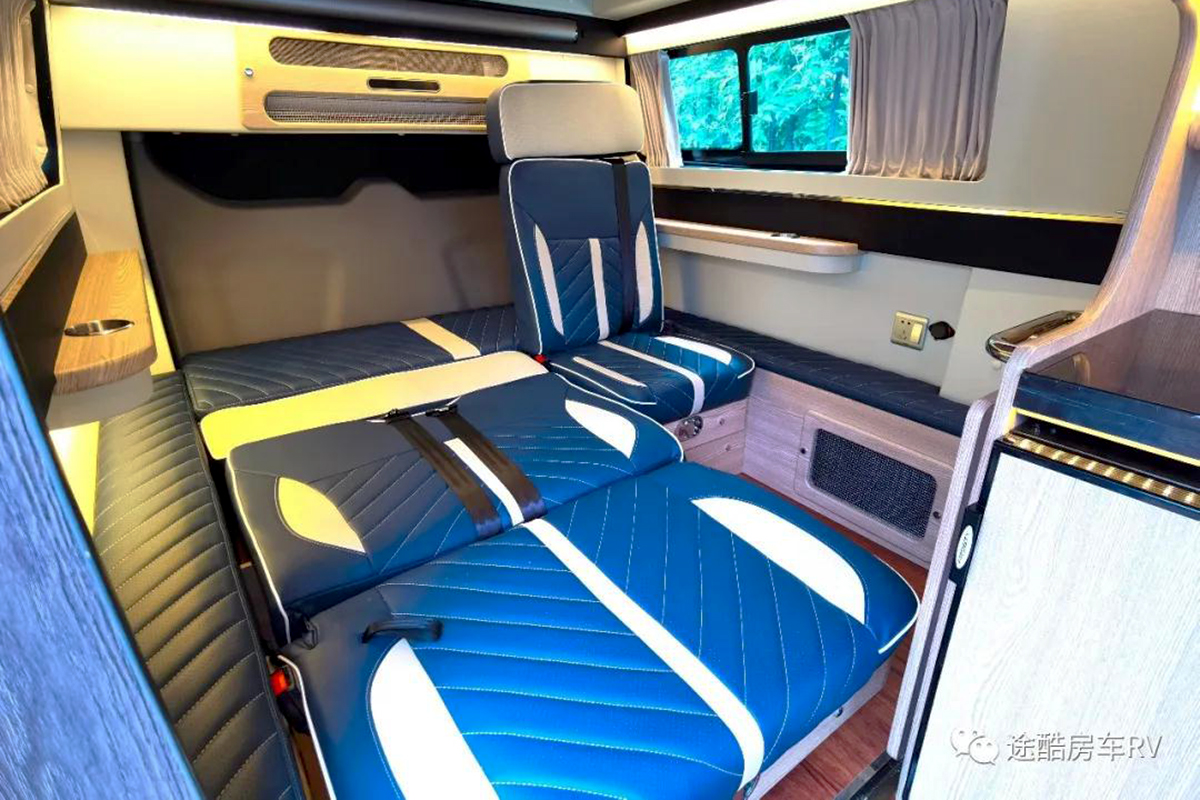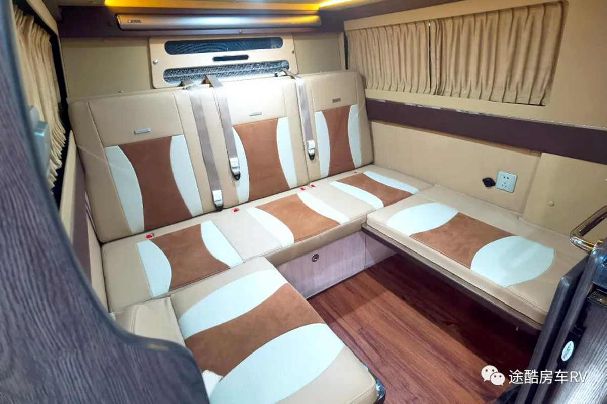除上述布局外,车内还提供后环形沙发布局,多样化的变换空间可满足不同人群的需求。车尾采用单排三人卡座设计,两侧配有悬吊式沙发座垫,将两侧沙发座垫放下后可形成一张U型沙发,满足多人会客需求。将卡座靠背放平后,卡座和沙发座垫还可组成两张单人床。