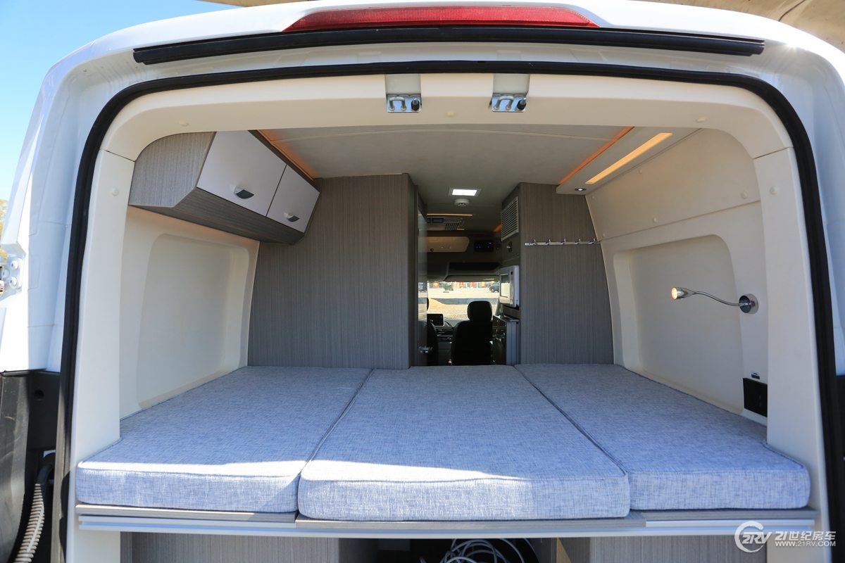 车尾是一张后横置床,车尾床尺寸为1850×1200(mm)。床位下方的区域是车内的最大的储物空间,从后门可以直接放行李物品,中间过道通过一扇门进行隔离。这块区域还设计有燃气舱,储物舱以及整车电池的总开关等。