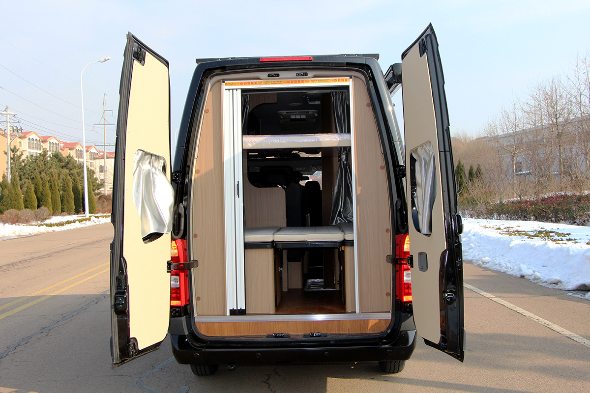车厢尾部是横置上下铺,上铺尺寸为1600×1140(mm),下铺尺寸为1760×1230(mm),满足两名乘客休息;上铺床板可全部拆卸,形成尾部单人床形式,下部中间床板可掀起,使车尾与前部贯通。其他电路及电器配置方面,300W太阳能电池板、300Ah锂电池及3kW充逆变电一体机、多美达顶置空调、4kW燃油暖风热水一体机、电源管理系统等。(文中配图由嵘野房车提供)