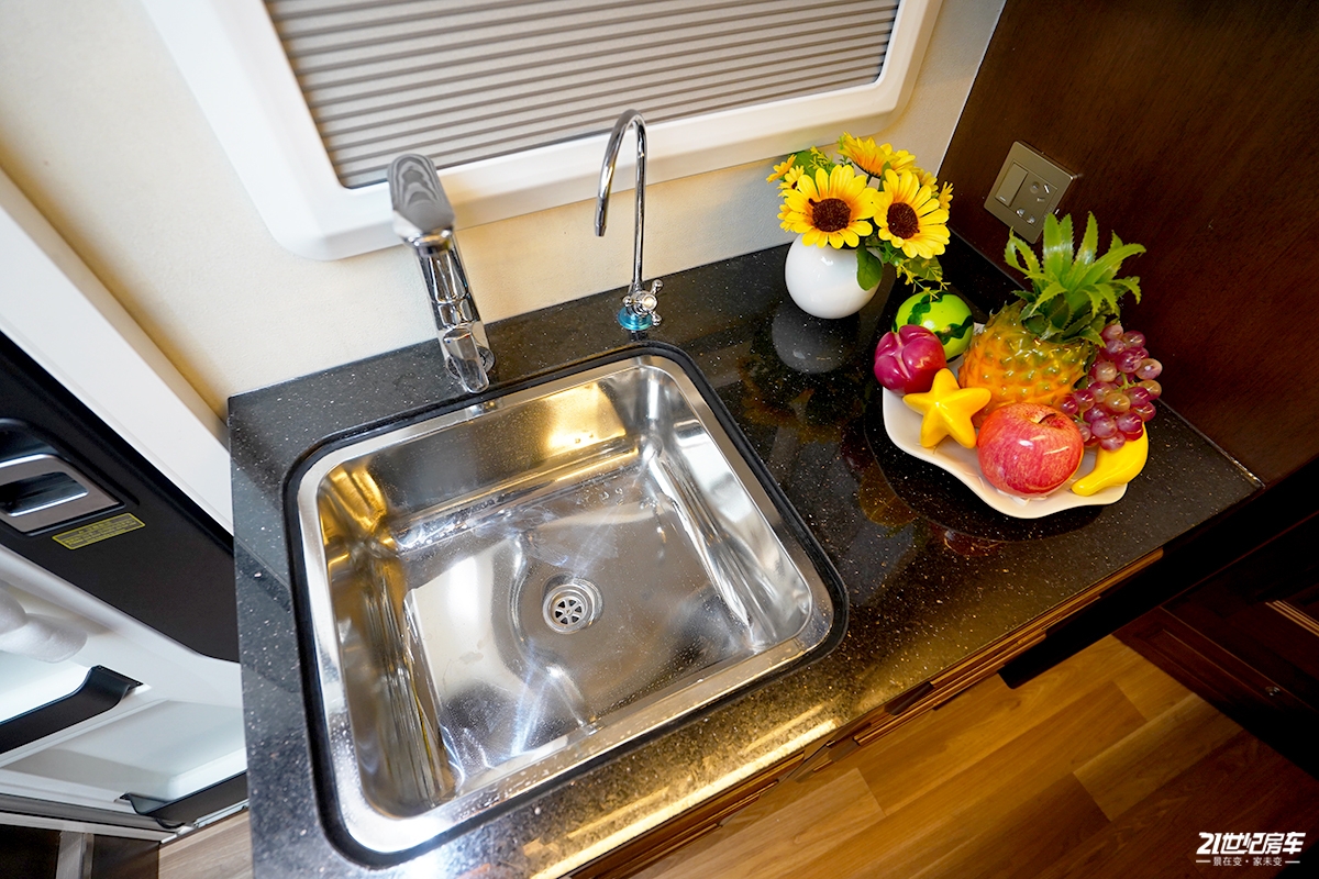 厨房区位于车厢中部,配有不锈钢洗手池、微波炉、ASCOLi油烟机及一台152L 12V双开门车载冰箱等;位于乘客门上方的房车智能控制系统采用触控屏设计,可控制车内照明及各个电器开关等;其它方面配备1台智能开水器、创新型净水和热水系统、车载水泵、伟巴斯特燃油加热系统等。