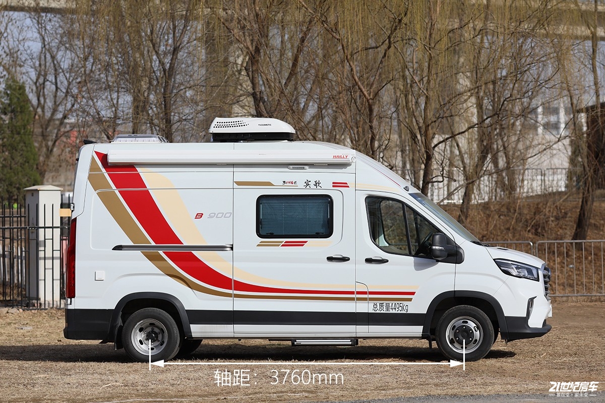 宾歌B900基于上汽大通V90厢式车改装,采用的是超高顶和加长轴的厢式VAN版本。从外形来看,外形基本上并没有过多改变VAN的属性,只有当看到顶部的驻车空调外机以及换气扇才能确认这是一款B型房车。宾歌B900继续沿用宾歌C型房车的拉花样式,整体外形呈现比较靓丽。