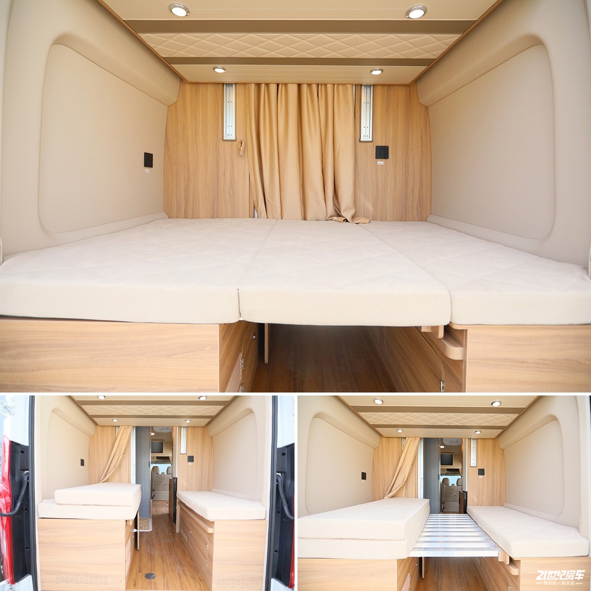 考虑到中间床板翻折的不便因素,宾歌B900固定床将中间床板采用抽拉形式隐藏于一侧床板之内,需要时抽出来转换成一张完整的横床,当过道储物的时候隐藏起立即可,节约了部分空间。