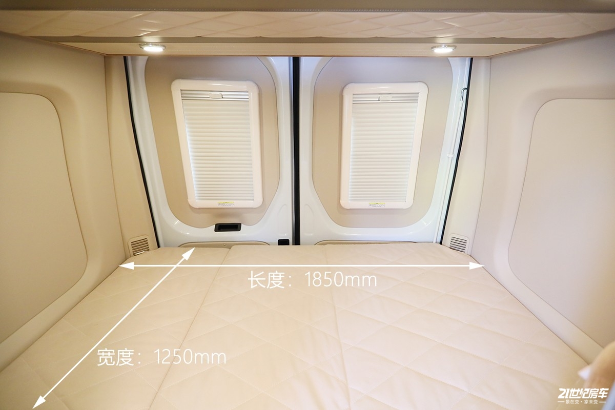 宾歌B900的车尾部分是以一张隐藏电动吊床和一张固定床位形式设计的,完全符合3口之家的用车需求,对于床铺的尺寸我们在下方图片会给大家标出来。床位尺寸在6米以内B型房车中算是比较不错的,而且舒适性打造的相当不错,对于金冠品牌来说这只是常规操作。