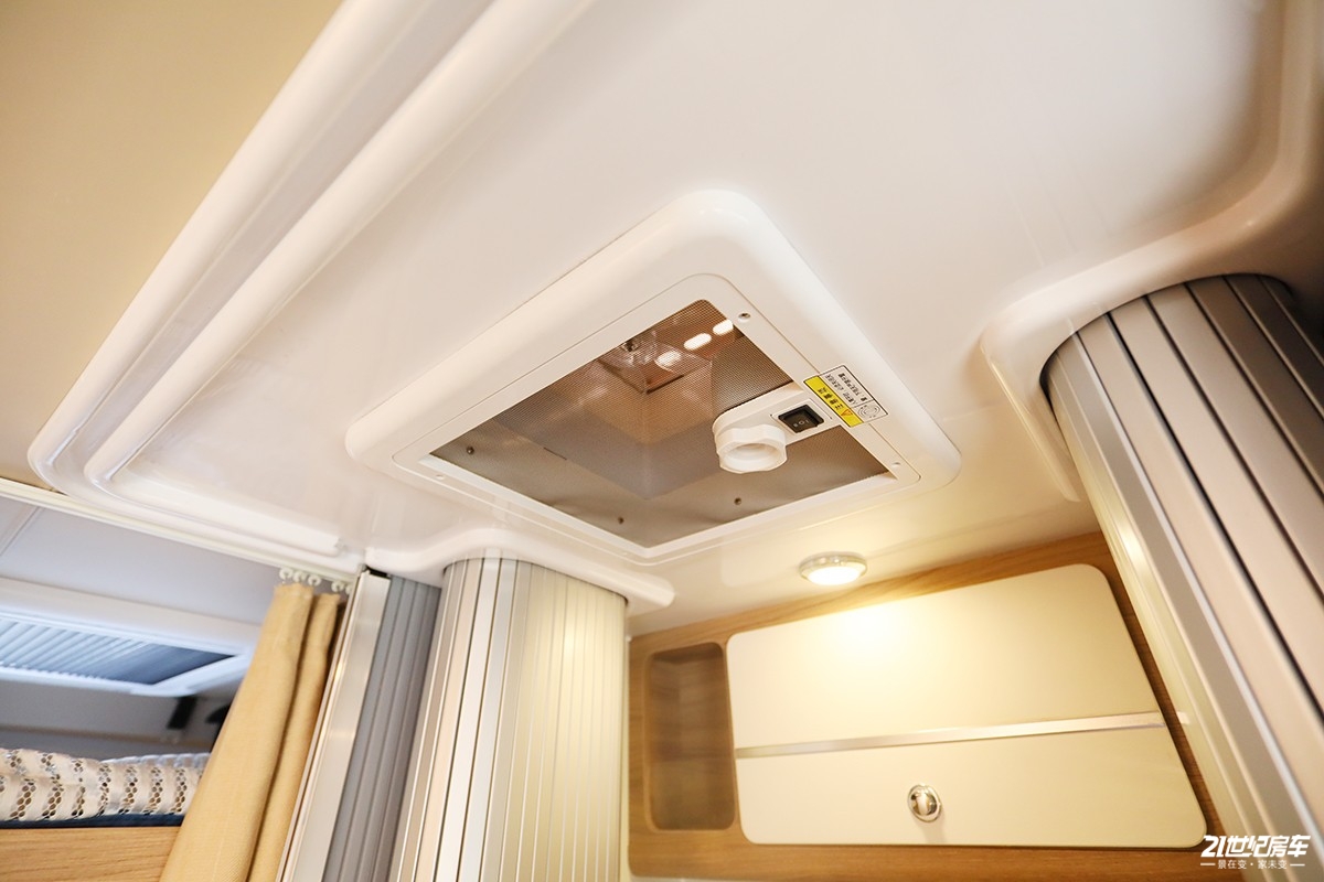 后横床的顶部是一张单人儿童床,90厘米宽度足以睡下一名儿童,作为防护,床头两侧都带有防护网。避免晚上休息顶部床位通风不畅,还装配了一款天窗(带有LED照明灯)。