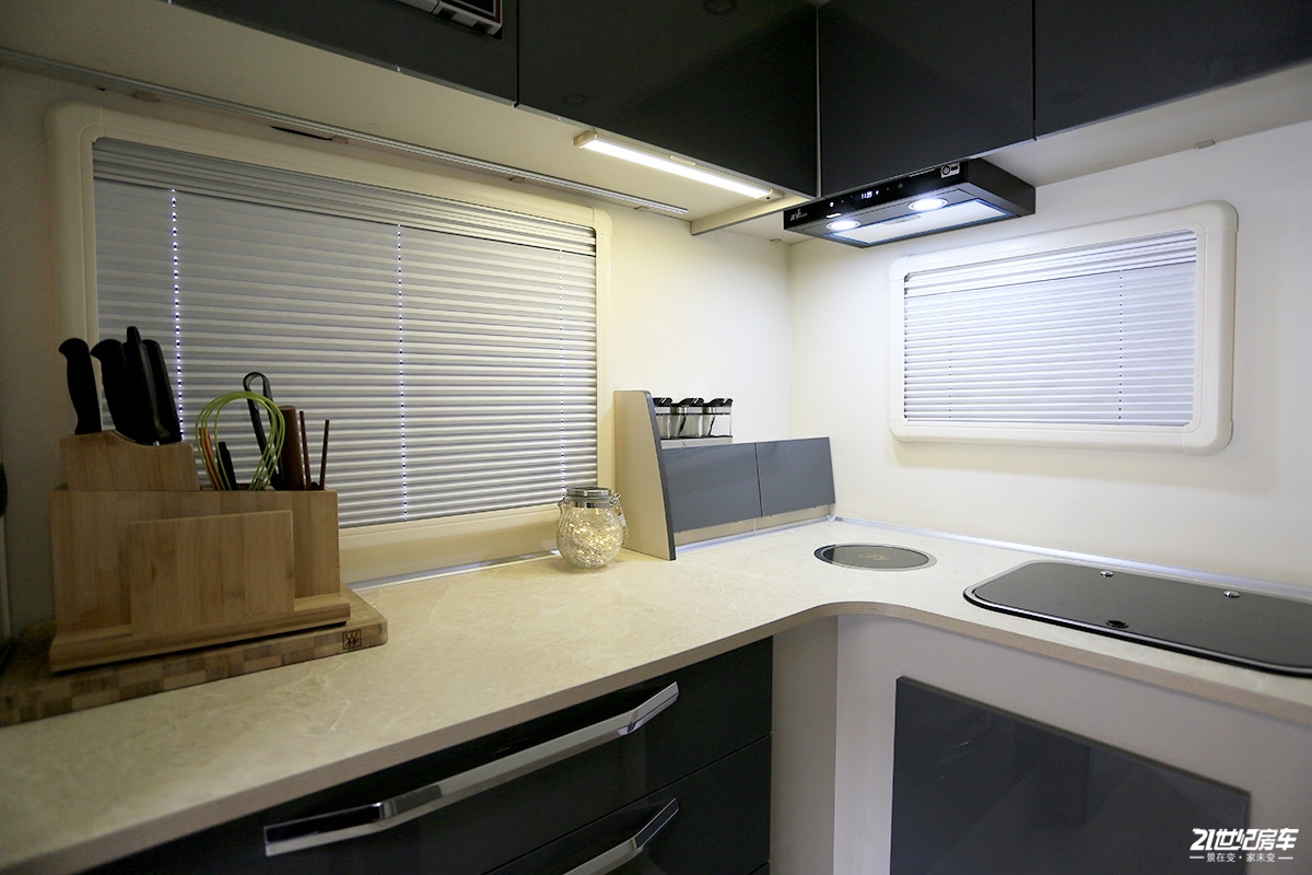 车尾部分是面积很大的灶台,入门车型配备900W电磁炉,高配车型标配室内进口灶具+进口燃气系统和微波炉。在电路方面,自由炮房车入门款标配2块120Ah生活专用免维护电瓶,也可选装高配车型的560Ah房车专用锂电池或840 Ah房车专用锂电池。水路方面,两款车型均标配150L净水箱,50L灰水箱+手动排污阀。