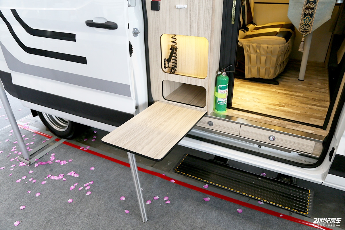 在外观配置上,七狼V90房车外部配备遮阳棚、顶置空调等,车内也可向外延伸一张小桌板供用户露营时放置物品。