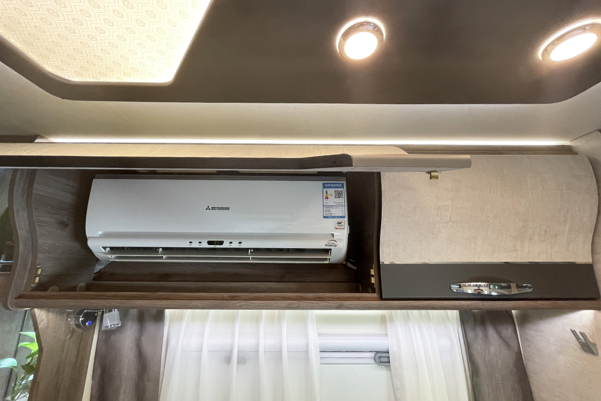 会客区装配一张L型沙发和升降桌。在配置上,侧窗配有整体窗纱窗帘、车顶柜及三菱家用变频空调等。