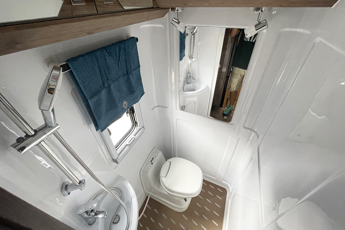 卫浴区域位于车尾部分,内部采用整体ABS开模吸塑一体成型,同时配有赛特福德盒式马桶、暖风管道、独立洗手面盆、冷热混合水龙头、淋浴花洒、美妆镜和多处储物格。