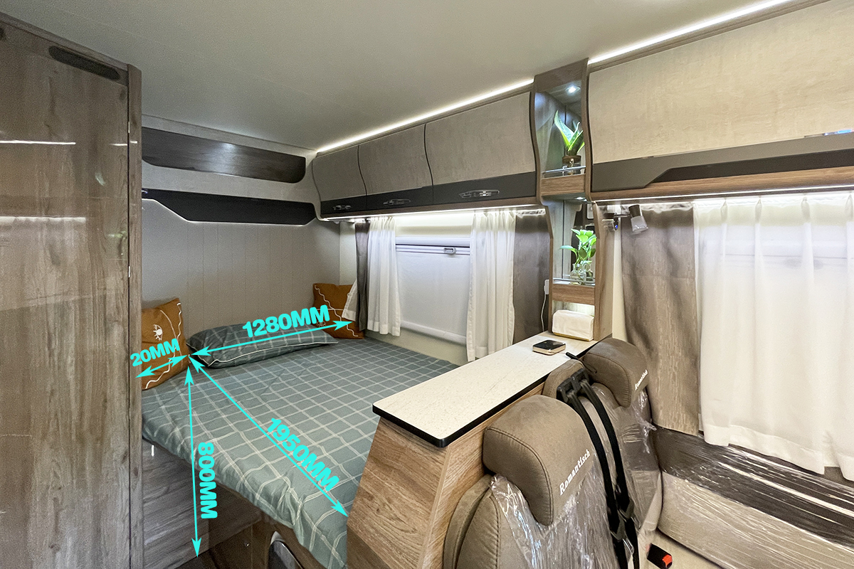 后部纵床尺寸为1950x1300(mm),上部配有阅读灯和12V USB插座,床侧为韩国大宇2.5KG洗衣机,下部是罗曼1号的恒温暖风系统。