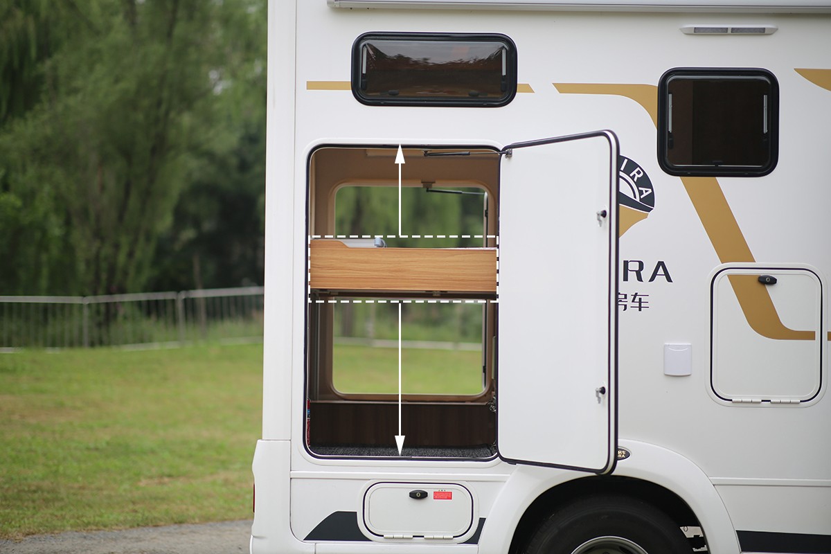 车尾这款大通舱是这款车最为显著的优势,一些用户长期在外旅行可能会携带摩托车/电动自行车等小型代步工具,这款大通舱完全是为这部分用户而设计的,同时也避免了将自行车绑定在车尾带来的安全隐患,亦或者丢失的风险。我们看到通舱之内两侧都有固定设备的金属导轨和锚点,用来固定设备。