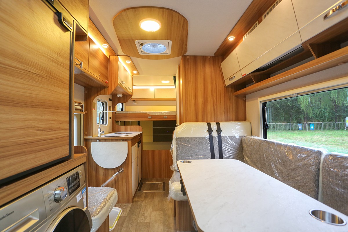 开拓者H500-Ⅰ车内采用和此前卓美亚卓越系列完全一致的南美胡桃家具饰面,车内氛围灯暖色偏深一些。这是一款当前用户比较喜欢的布局,L型沙发+后置横床,整车核载6人,可以满足最多5人的睡眠需求。作为轻卡房车,车内空间确实不小,配置也非常高。由于车身整体偏高,车内从地板到车顶的净高度非常富裕,即便是2米身高的大个子依然能够自由行走。