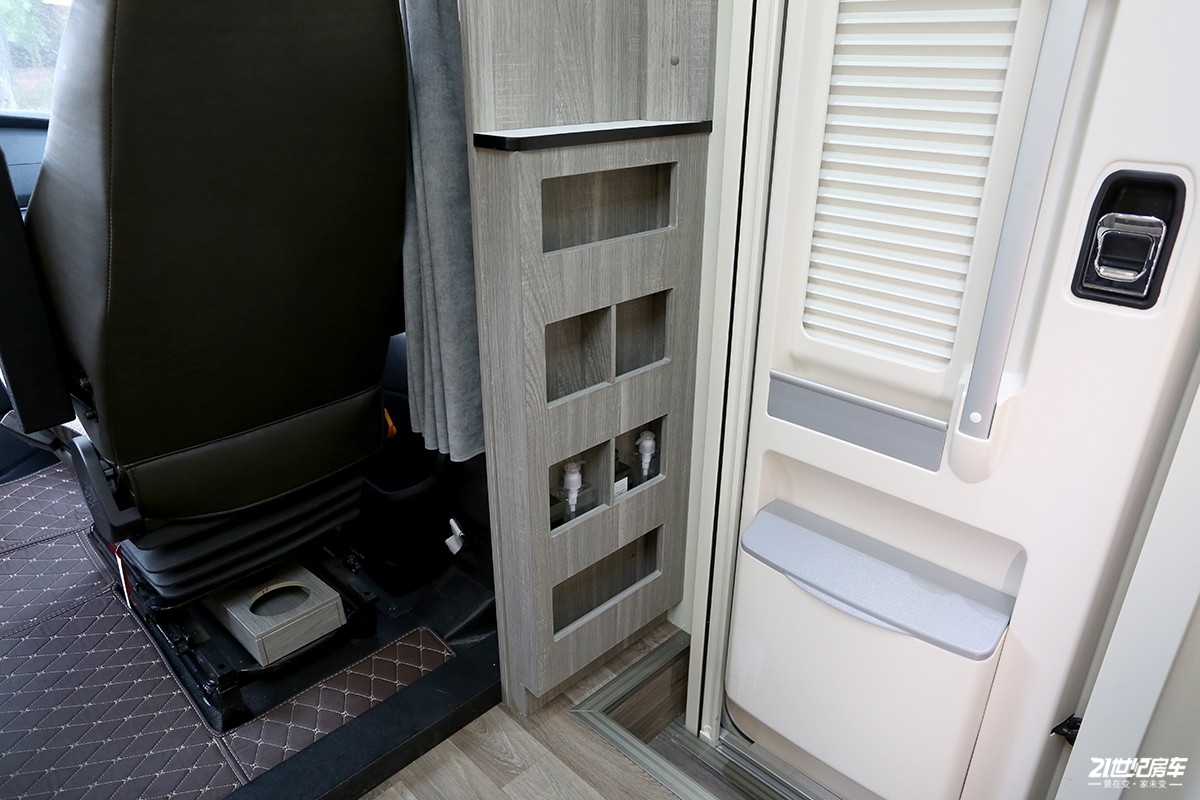这款车的厨房区有两点需要说明:第一,空间尺寸大,使用起来不局促;第二,实用性强,配置合理。空间尺寸上达到了1470×530(mm),再加上左侧折叠板,总长超过了1.8米,这可以算的上是比较豪华的厨房。另外,从实用角度来看,整个操作台很大,但是没有配备固定电磁炉或其他燃气灶,留出的空间就比较利用用户自由选择做饭工具,洗手池采用的是两折叠形式的水龙头,使用之后可轻松收纳于水槽之内,厨房区还配备了一款电子感应的洗手液设备。