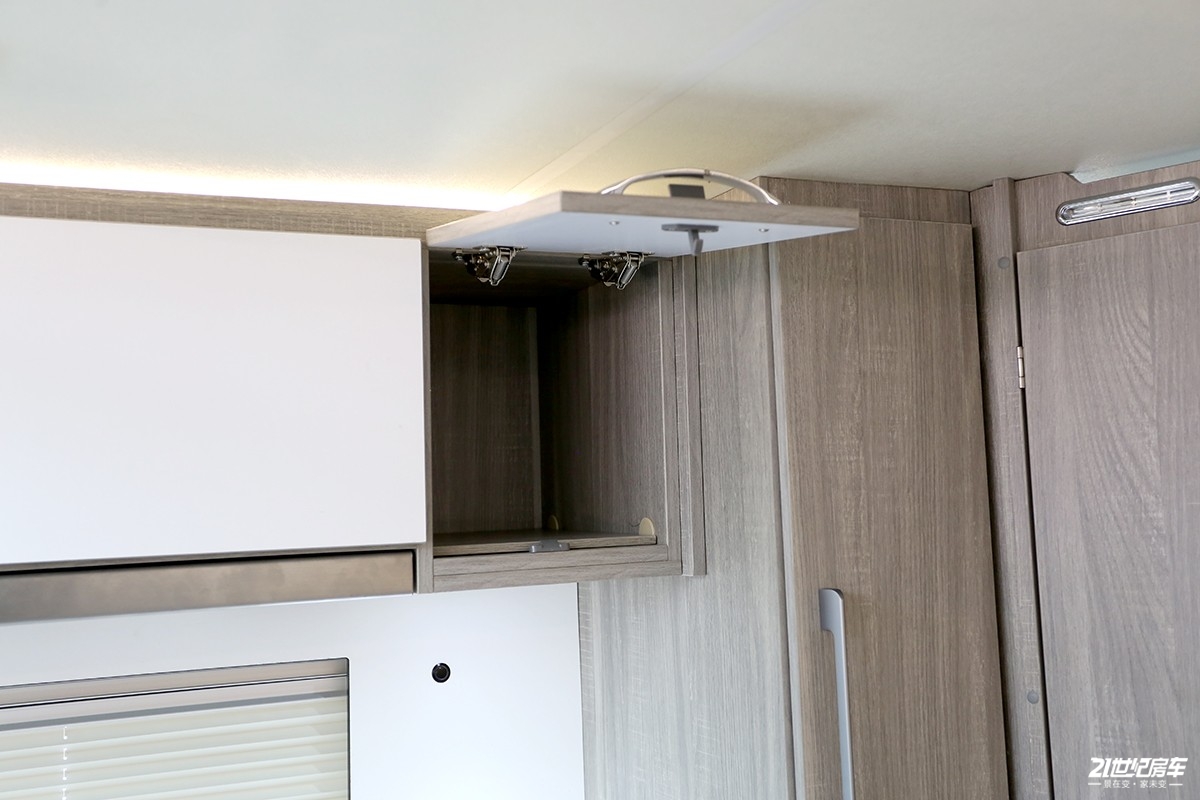 “一切没有衣柜的房车都是不完整的”,尽管衣柜不大,但还是配备了一款上下贯通的衣柜间,分为两下两个部分。