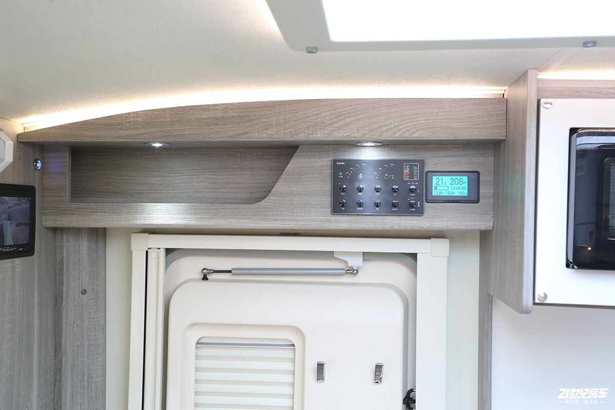 乘客中门顶部是一款拓宝按压式薄膜总控制面板,右侧是生活电瓶的库仑计。电路系统方面,新车标配12V 1000Ah锂电池(12度电),3000W充逆变一体机,600W太阳能电池板硬板。