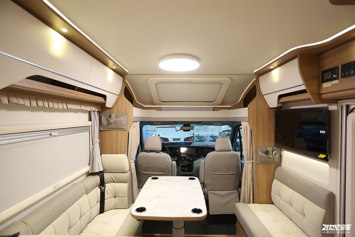 车的内装部分,宾歌CX510对于内装的把握非常独到,受助于商务车改装经验,房车的内饰工艺及色彩搭配都能够达到精致二字,全新中国风的家具以及沙发配色,颇有些小资的味道。布局方面,CX510选用的是环形沙发+中后置厨房+后拓展床的基础布局,这款布局目前并不多见,车内只有一张完整的大床,客厅区域保留完整,不论是空间上还是居住舒适性上,都是非常不错的。宾歌CX510还引入智家居理念,车内配备的小米智能家居系统可通过手机APP控制,远程开关调节、语音唤醒等现代科技智能家居服务,比如小米32寸高清液晶电视、小米智能开关系统、小米电视音箱。