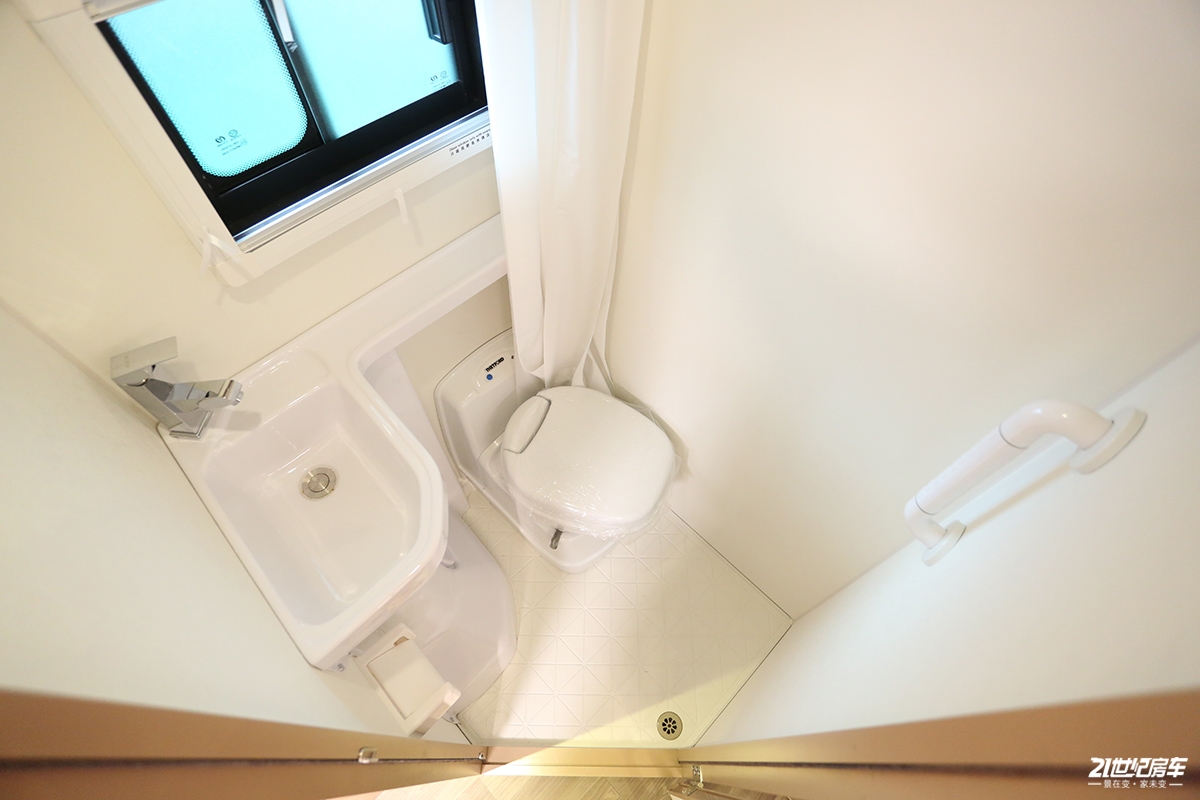 卫生间采用SMC复合航空材料打造的整体式卫浴,耐水防霉,宏业燃油热水一体机提供暖风和热水。卫生间配有赛特福德18L可旋转盒式马桶、洗手池、花洒、双向排气扇、侧推窗、储物柜,水路系统方面配有净水箱160L,灰水箱45L。电路系统方面,标配400Ah免维护电池,3000W充逆变一体机。
