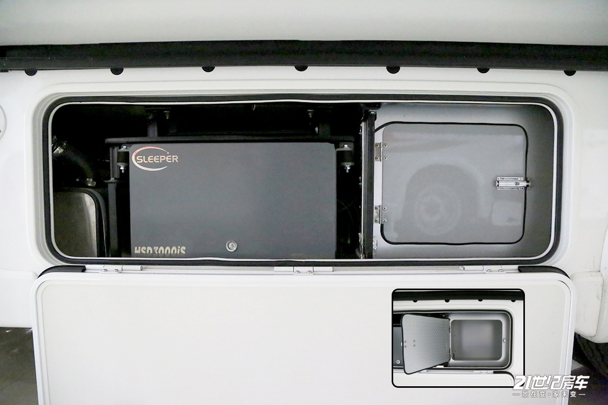 车身外部功能齐全,左侧配有泓晟达直流车载静音发电机,采用进口隔吸音材料加上特殊结构设计的吸音金属机箱,牢固降噪,运行平稳,噪音震动小,具有高效、可靠性好、持久耐用、安装方便等特点;相邻的是内置储物舱,空间可观,带有卡扣,安全性高;向后看则是煤气罐舱,配有固定卡槽,可保证行车稳定性。