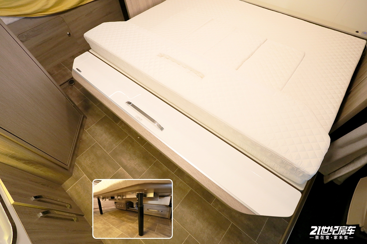 车内最大的亮点在于拓展区配有一张侧拓展翻转双人床,顶部配有扳手,便于操作;可将靠垫随时拆卸,通过外侧延伸收纳床板可增加床铺使用面积,变为一张尺寸为1900×1900(mm)的超大固定床,同时配有豪华床垫,厚实回弹性好,提供舒适的质感;另外,收纳床板下方设有收纳支腿,使用时只需从固定扣卸下即可,牢固可靠,将生活区空间合理利用。
