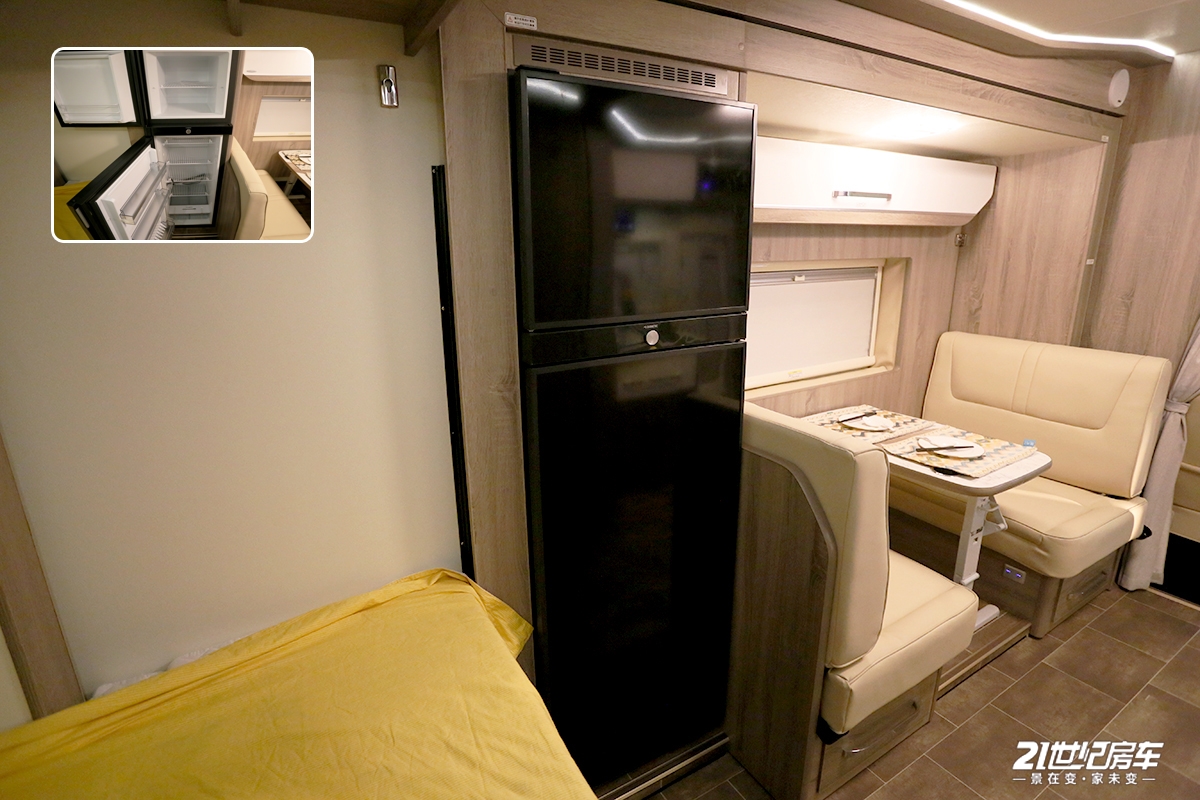 会客区采用双人对卡座沙发+折叠餐桌的组合形式,临时可拼成一张沙发床,座椅下方还配有储物空间,可存放物品。侧面墙壁上的外推窗具备采光及通风换气功能;卡座后方一台多美达224L双开门冰箱,冷藏冷冻都可以,满足长期旅行的食材储备需求。