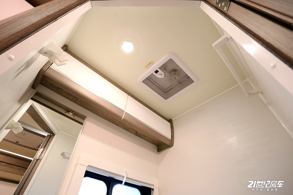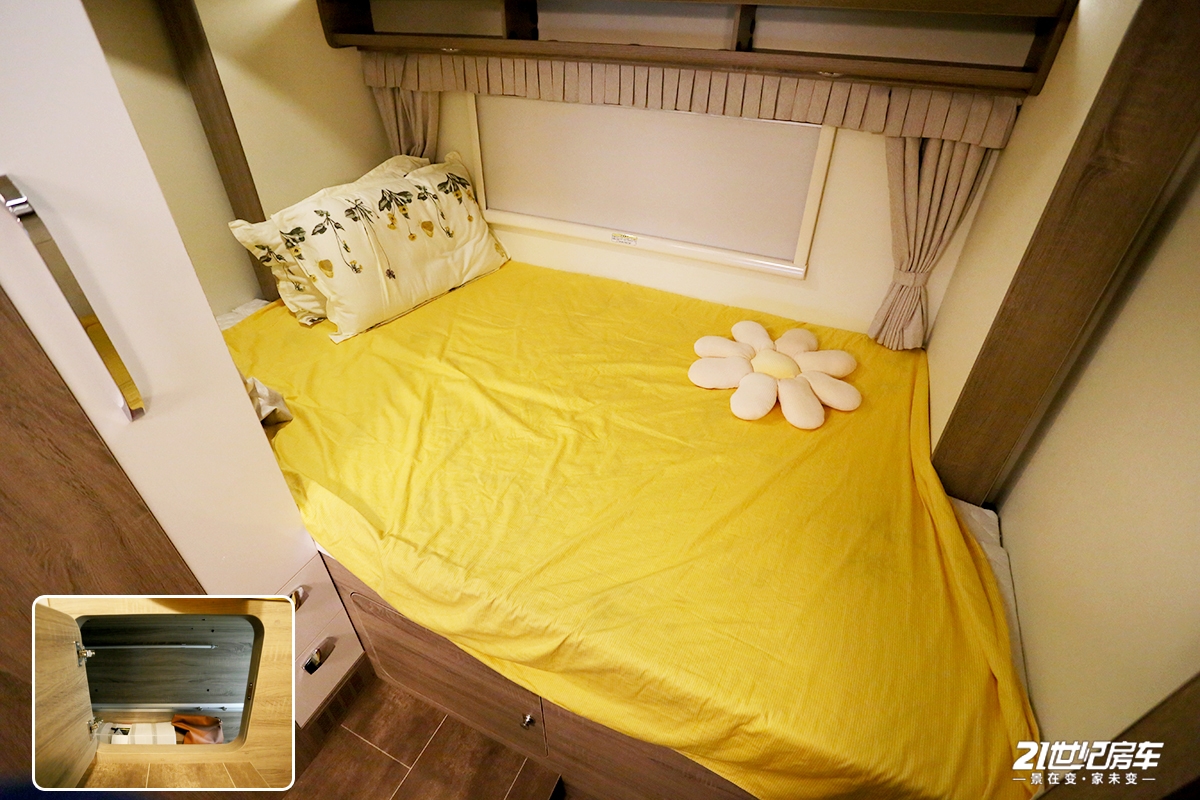 后横置床拓展后可变成一张尺寸为1900×1250(mm)的双人床,满足一大一小还睡眠使用,上方敞开式储物槽及吊柜满足日常收纳需求。尾部车窗面积可观,采光及通风换气效果不错,还能随时欣赏窗外的风景。(图文摄/21rv张斯粤)