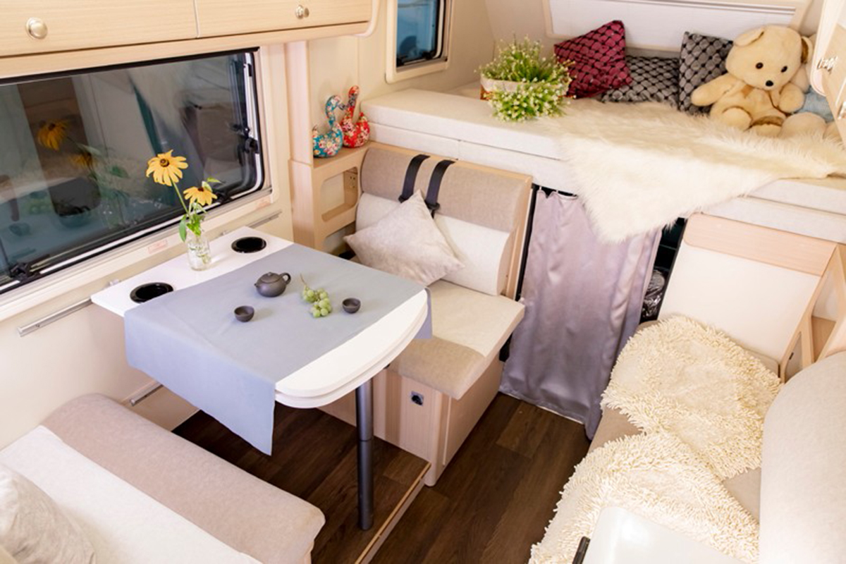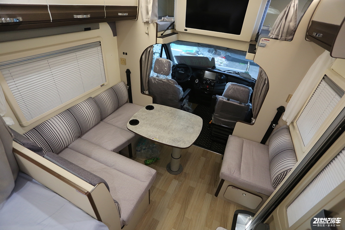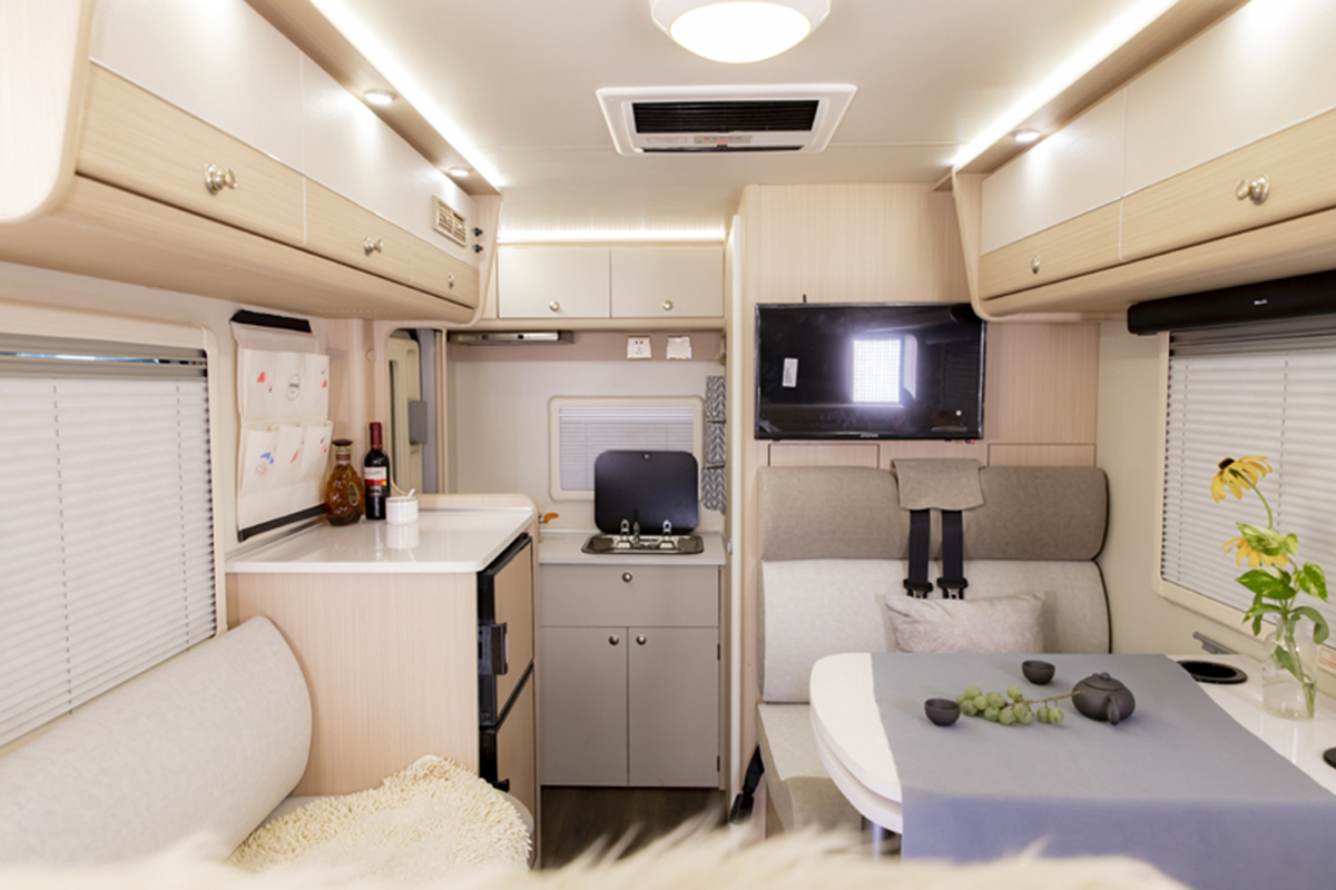 在生活区域,览众C7-A由额头床+对座沙发+厨房+卫生间+后置单人床组成,整车核载6人,车内可供至少5人休息。额头床区域空间很大,2-3人入住没有太大问题,且配备了实用的电源接口。会客区域可将沙发、餐桌拼接成一张双人床铺,车顶柜还可存储物品。在配置上,览众C7-A标配24英寸液晶电视+音响系统。