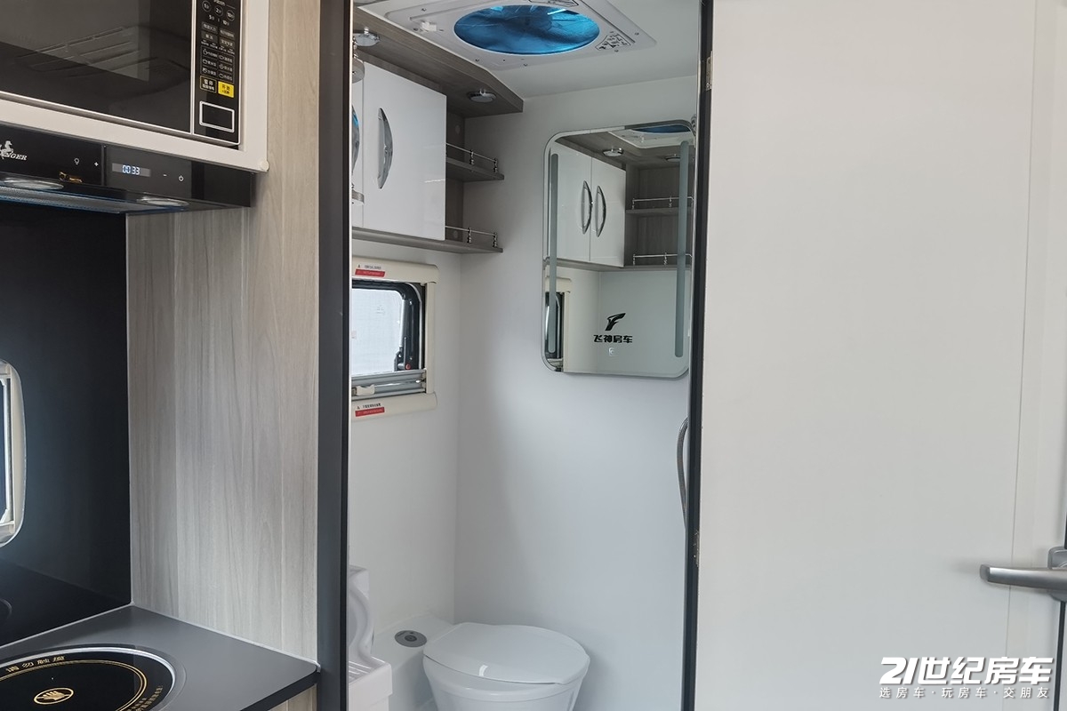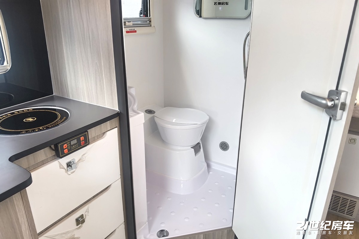 飞神达尔文Z75的厨房区和常规双拓展房车略有不同的是,厨房台面并非规则的长方形,而是采取了L型的操作台,不过外凸的操作台并不是很明显,只是为了可以将3kg mini洗衣机安置到该区域做出的合理化设计。厨房区配备了洗菜池、高脚水龙头和电磁炉,顶部吊柜区域配备了抽油烟机和微波炉,整个厨房区的配置已经比较完备。