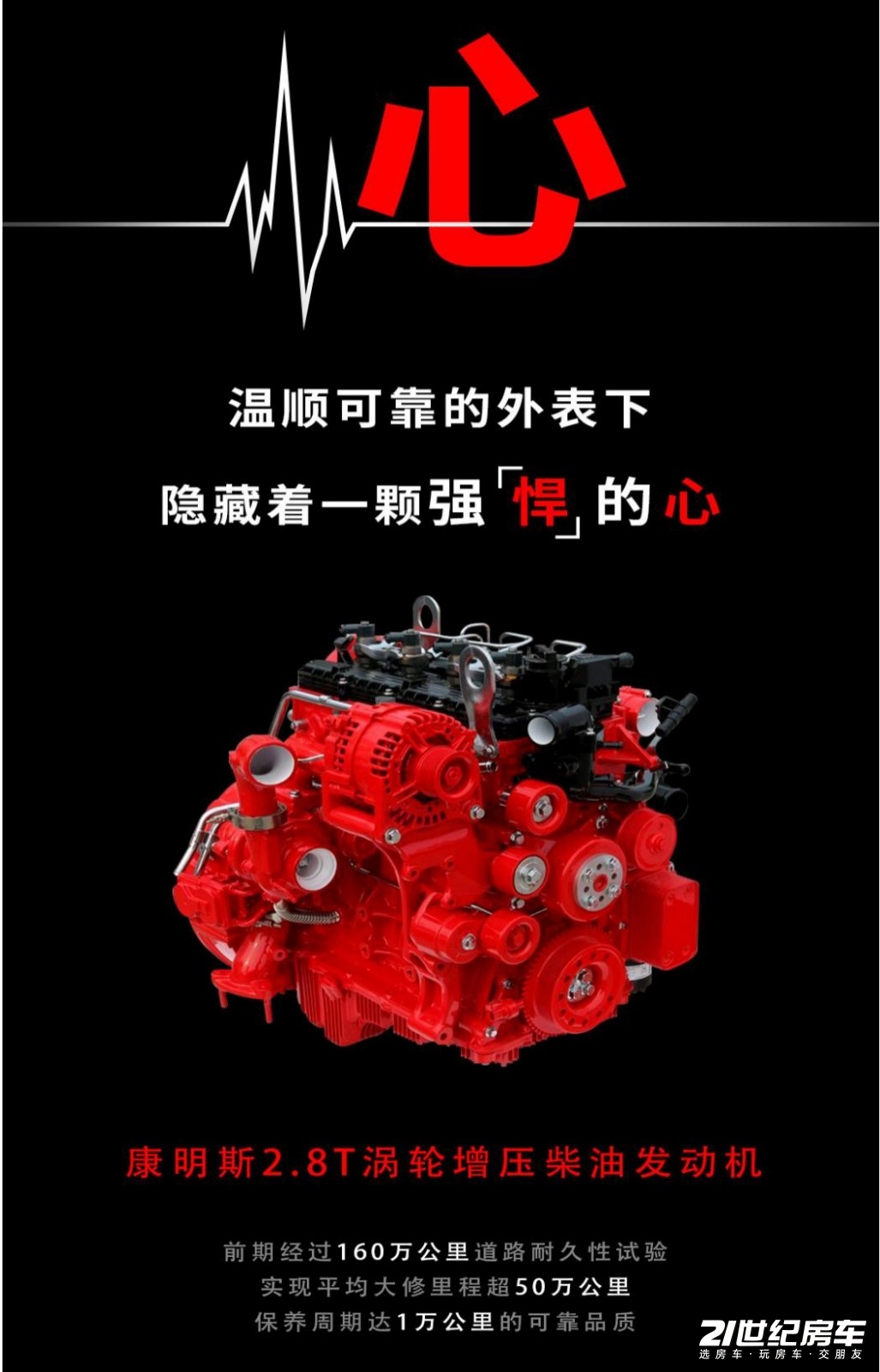 超劲“大心脏”: 搭载百万公里无大修的康明斯发动机,符合国六排放标准,2.8T大排量,177大马力,130Kw大功率,360N·m高扭矩,振动小、噪音小、可靠性高、耐久性强、燃油经济性好,真正的超劲“大心脏”放您无惧艰险,勇往直前!