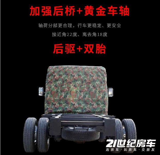 后双胎设计,全尺寸备胎,接近角22°/离去角15°,非承载式车身更适合房车使用、舒适性和稳定性兼备的同时,提升驾驶体验!