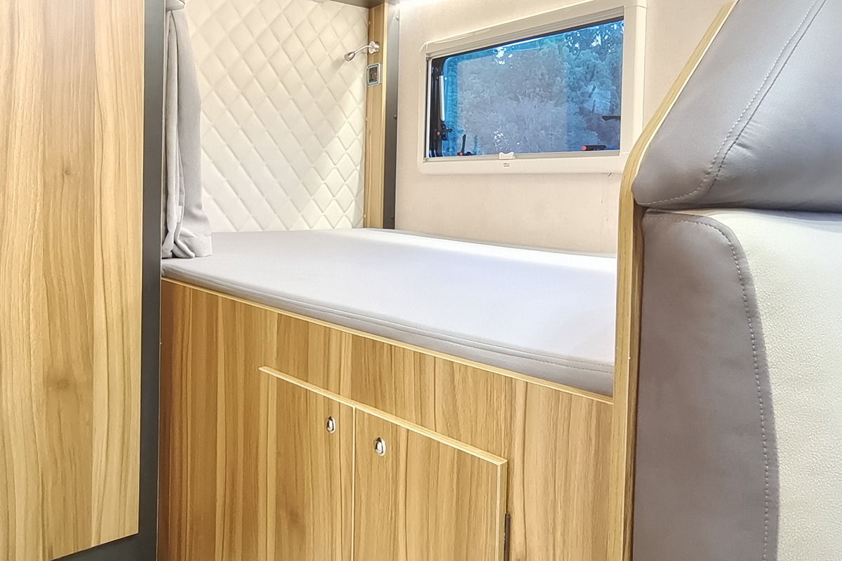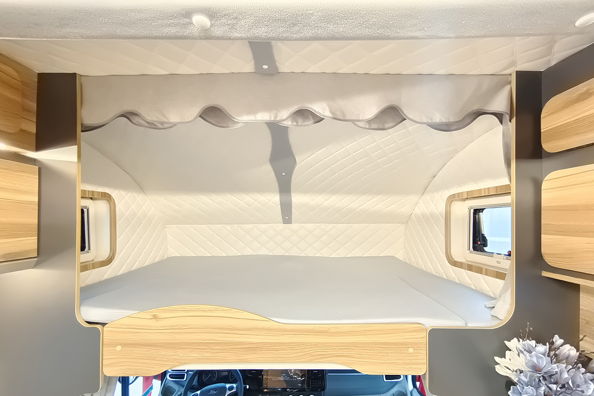 后置纵床尺寸为2000×1200(mm),满足两人睡眠,原厂自带豪华海绵床垫,舒适性和回弹性好;周围墙壁同样做了软包处理,阅读灯及220V充电接口也是常见配置;顶部吊柜可收纳被褥等物品;床板下方就是大容量储物舱置物空间,足不出车也可直接拿取物品。另外,隔断帘也能保证尾床独立区域的私密性,避免被生活区打扰。