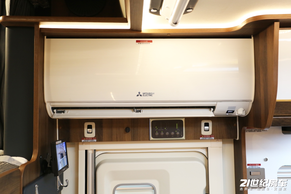 中门上方是三菱1.5P变频空调,出风口可直接照顾到额头床和会客区,下方拓展舱控制按钮设计成了乘用车车窗升降键形式,类似铝制材质更突出质感。