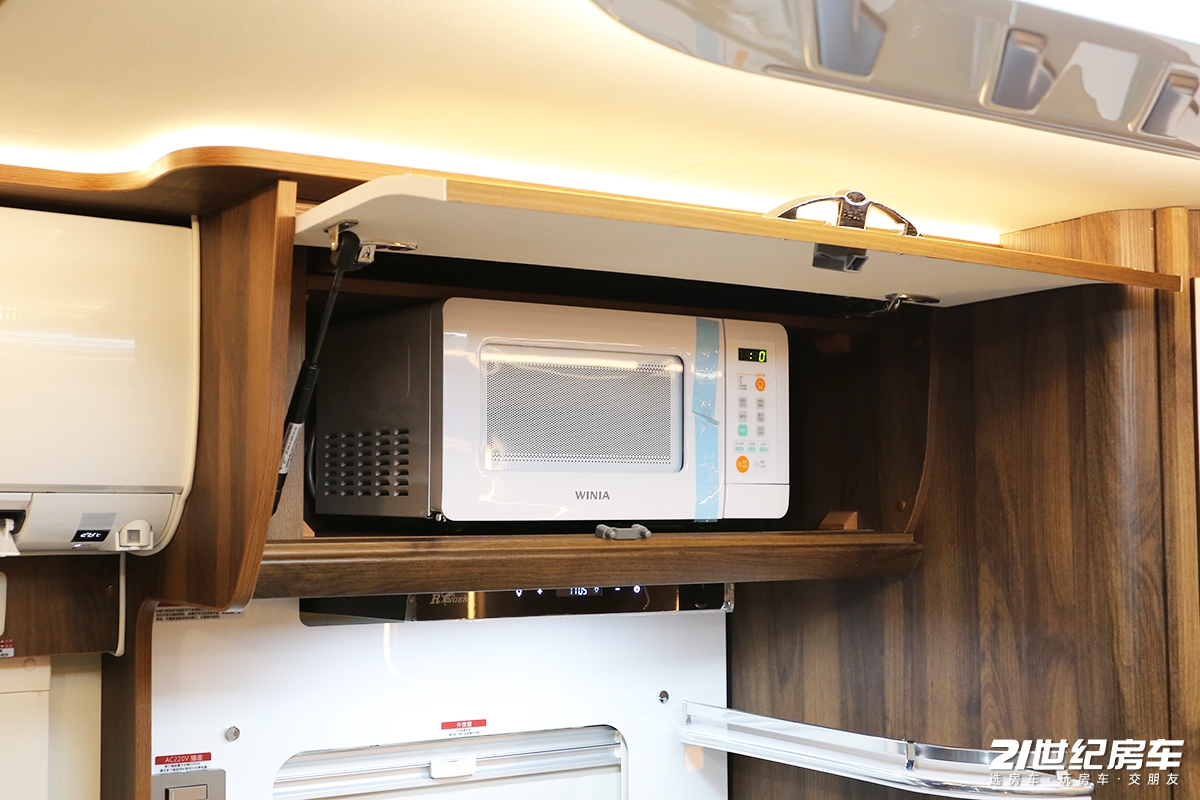 顶柜还内置一台微波炉,同时下方配备了抽油烟机供用户使用。