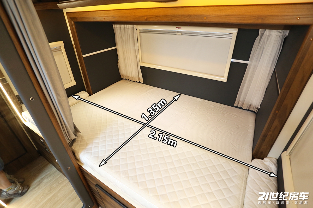 额头床配有侧窗、顶窗,可提供采光通风作用,最内侧还设有一处储物槽便于存放零碎物品。额头床的尺寸为2.2x1.2(m),可供两名成人休息。