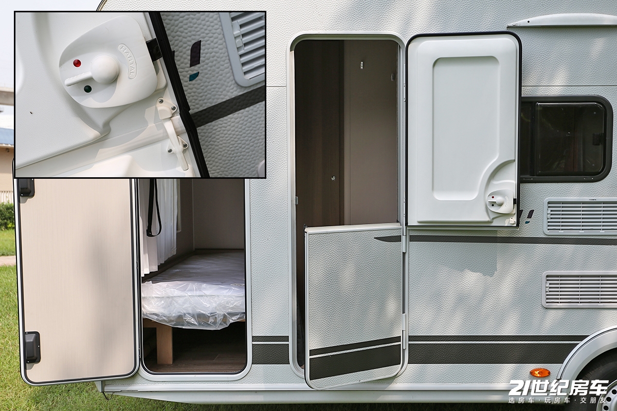新车的功能区集中在车身右侧,后方舱门打开并不是行李舱,而是尾床区域,进入生活区我们就会看到内部结构,中门一侧是多美达三能源冰箱散热口。