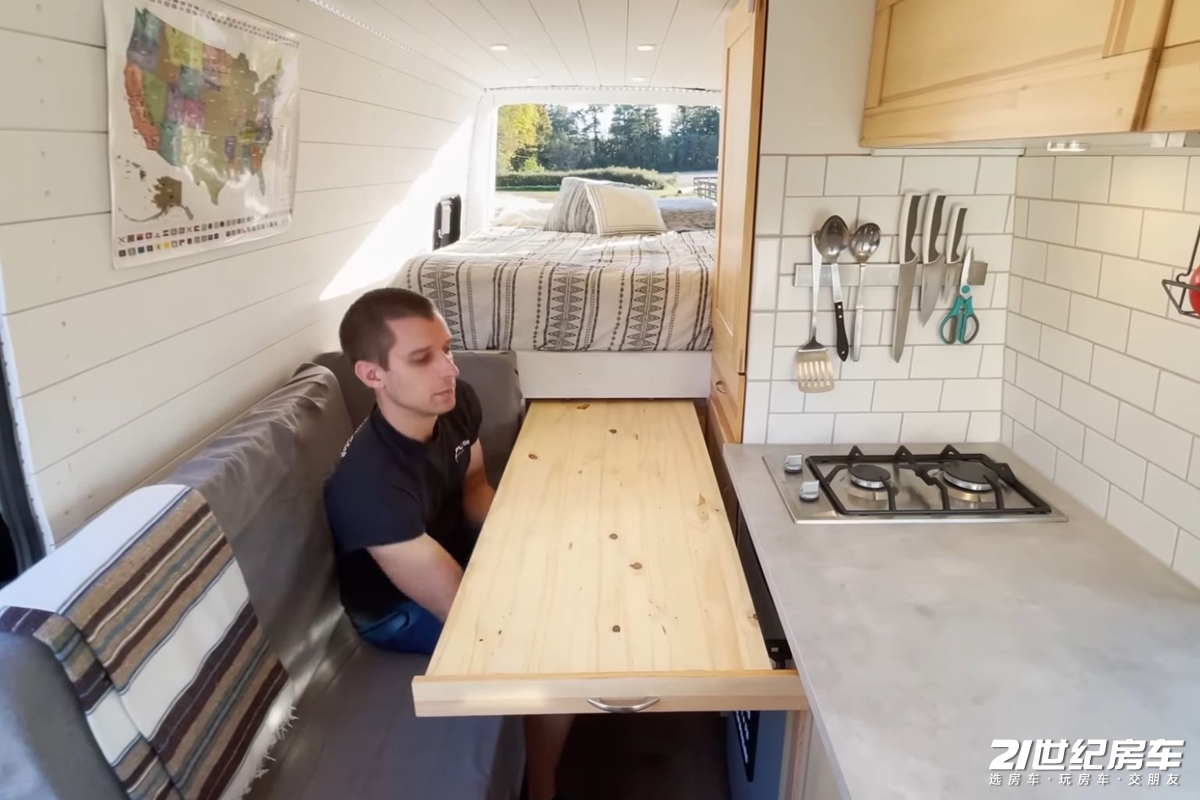 贝克和奥斯丁将后置床设置为了纵向,因为两人都是高海拔,超厚实的全尺寸床垫也让他们能够睡得更加舒适。床铺侧边的两个储物柜伸手就能够到,存放一些日常衣物。