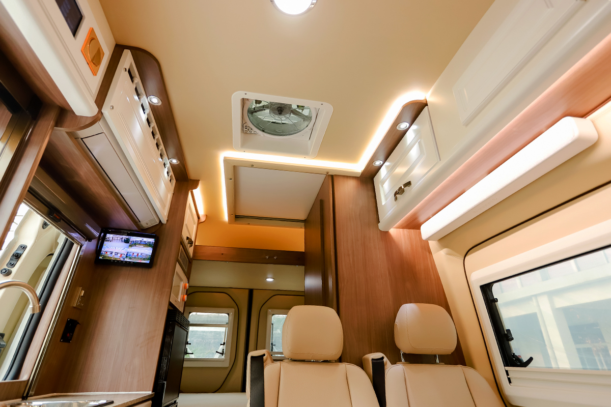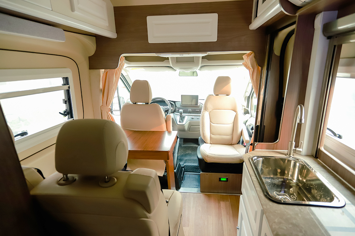 整车内饰及车顶为软包、驾驶区及车门处采用隔热棉及止震板设计,起到隔音及保温的效果;车内米/白色座椅包覆处理,板材分为红色及浅色两种;部分实木家具+游艇地板革设计更加贴合居家氛围感。整车核载4人,还有五座版可选,采用前二后三座椅布局。另外,副驾座椅增加手动旋转功能,方便与后排成员交流,除顶部收纳空间外还配有一台吸顶式19寸车载网络电视,匹配的娱乐设施则为车载音响系统。