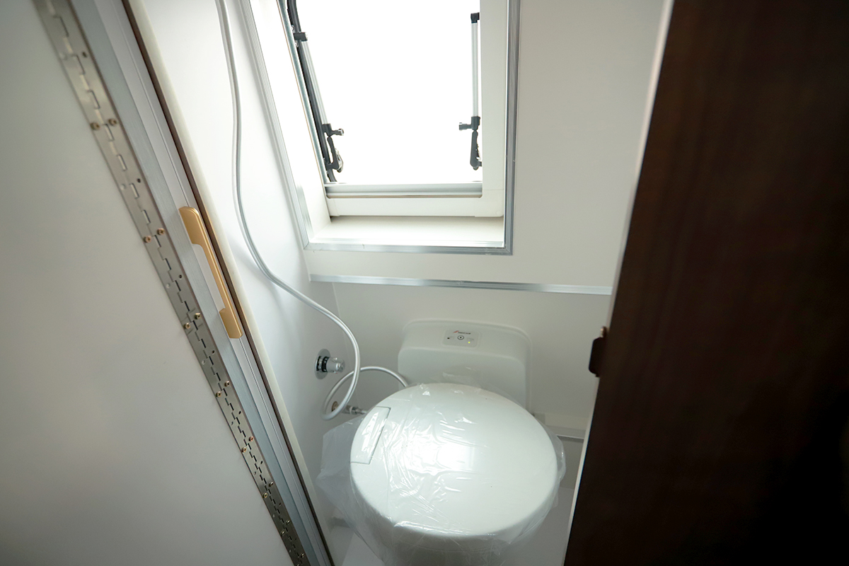 会客区后方则是卫浴空间,由于B型车空间相对紧凑,则采用整体抽拉式设计,收回后可作为过道使用,需满足如厕或简单淋浴需求时,只需通过顶部导轨向外滑动形成一个独立私密空间,操作方便;内部配备进口福莱康普盒式马桶、卫生间淋浴等。为提高车内的通风换气效果,在卫生间旁边顶部单独设计有电动换气扇。