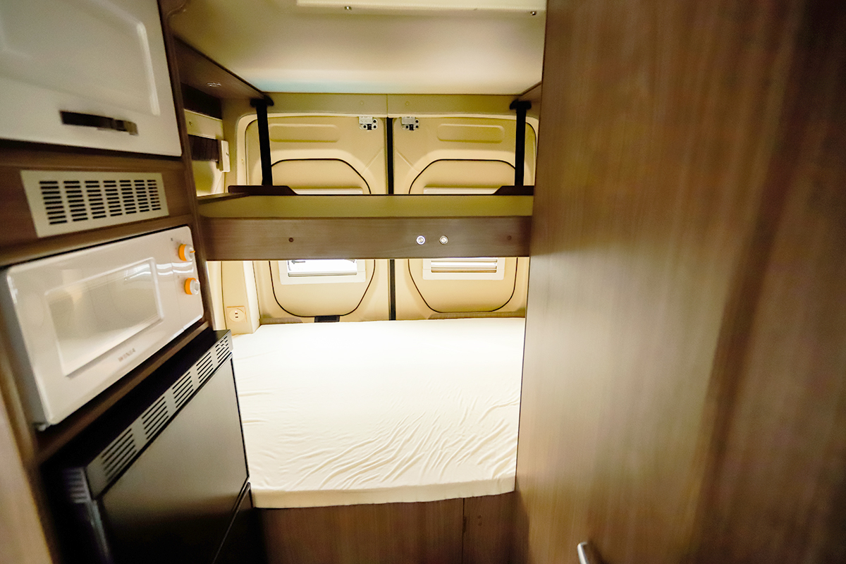 车尾采用横床布局,顶部则是一张电动升降吊床,空间得到了最大化利用。虽然两侧并未设计窗户,但对开式尾门打开后,使得车内布局一目了然,采光及通风换气效果更佳。床铺下方单独配备有韩国大宇洗衣机,解决换洗衣物的问题;旁边提供一定的储物空间,可收纳行李及随车工具等。打开隔板还与前方相通,形成贯通式设计。