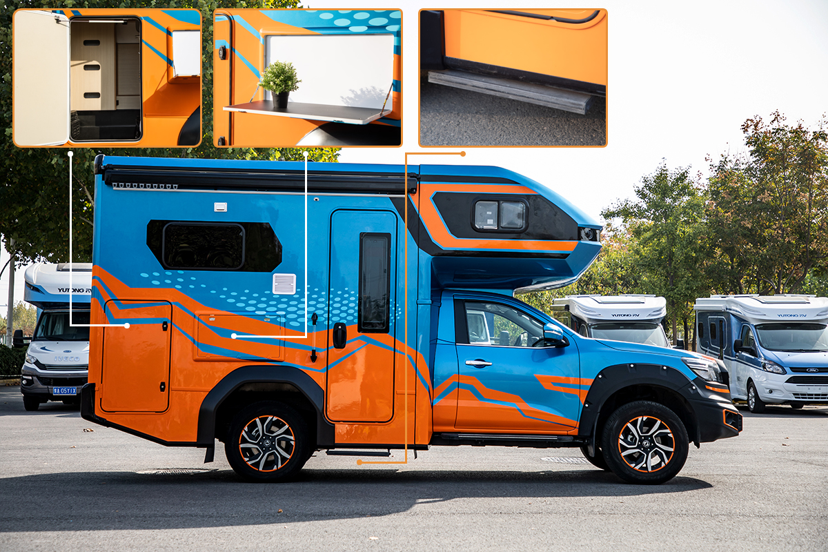 宇通皮卡房车的车身尺寸为5990×2220×2990(mm),轴距为3400mm,油箱容积为73L;作为首款皮卡车型,底盘方面选用的是与纳瓦拉同平台打造的郑州日产锐骐6底盘,累计超过100万公里的道路试验验证了整车底盘良好的可靠性和耐久性。另外,采用一体式中顶,两侧无压条结构设计,杜绝了积水和漏水风险。原车外观方面,标配为茉莉白免漆涂层,深浅双色的装饰色带,轮廓分明,流畅的车身线条,从正面看极具视觉冲击力。而文中车型则采用极地蓝喷漆涂层,蓝橙双色搭配效果使整车动感而富有活力,更加趋向年轻化的审美理念,但需选装,用户可自行选择。