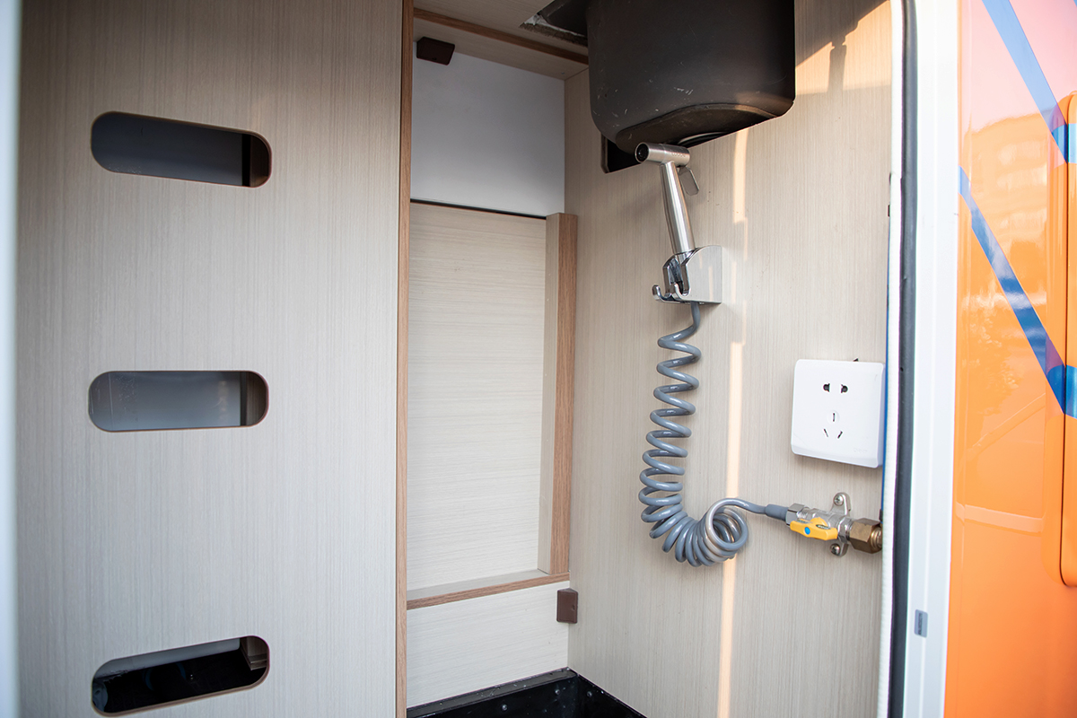 卫生间采用干湿一体式设计,地板设计有凹槽处,利于废水快速排出,而且地板造型设计具有一定防滑效果;内部配备盒式马桶、洗手池、梳妆镜、晾衣杆、储物吊柜、通风窗、暖风口、换气扇及独立式淋浴花洒等;水路系统方面,这款车匹配150L净水箱,60L灰水箱+手动排污阀及智能水泵。
