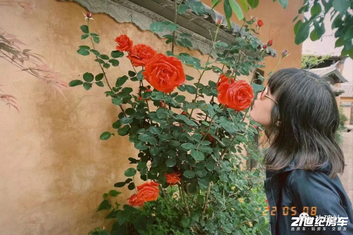 所以有一对做房车装置的顺德夫妇在沙溪开了一个玫瑰庄园,他们每年都抽一半时间来这边呆着。门店就在四方街,他们雇的白族店长请我们进去喝了一道大马士革玫瑰茶。我买了一包玫瑰曲奇,她又送了一袋鲜蚕豆和七八朵刚采下来的墨红玫瑰,让我们在房车煮食。