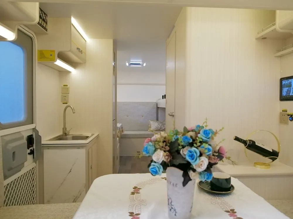 璀璨生活,切换自如。谷雨DE480L三人版拖挂房车内部空间宽敞,丰富的储物空间,便于收纳生活用品,让旅居生活更简单舒适。