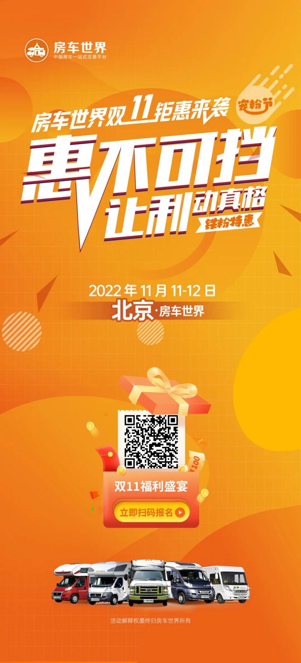 双十一活动现场促销品牌近20余家,宇通房车、隆翠房车、上汽大通原厂房车、宽河驿马、览众房车、瑞弗房车、戴德房车、壹万房车、金冠房车、谷雨房车、法国卡莱尔房车、德国海姆、爱旅房车、迷野房车、梦旅房车、爱旅途房车、尔湾房车、齐星房车、特莱特房车……无论是自行式,还是拖挂式,心仪的车型都在房车世界!快扫码报名吧!