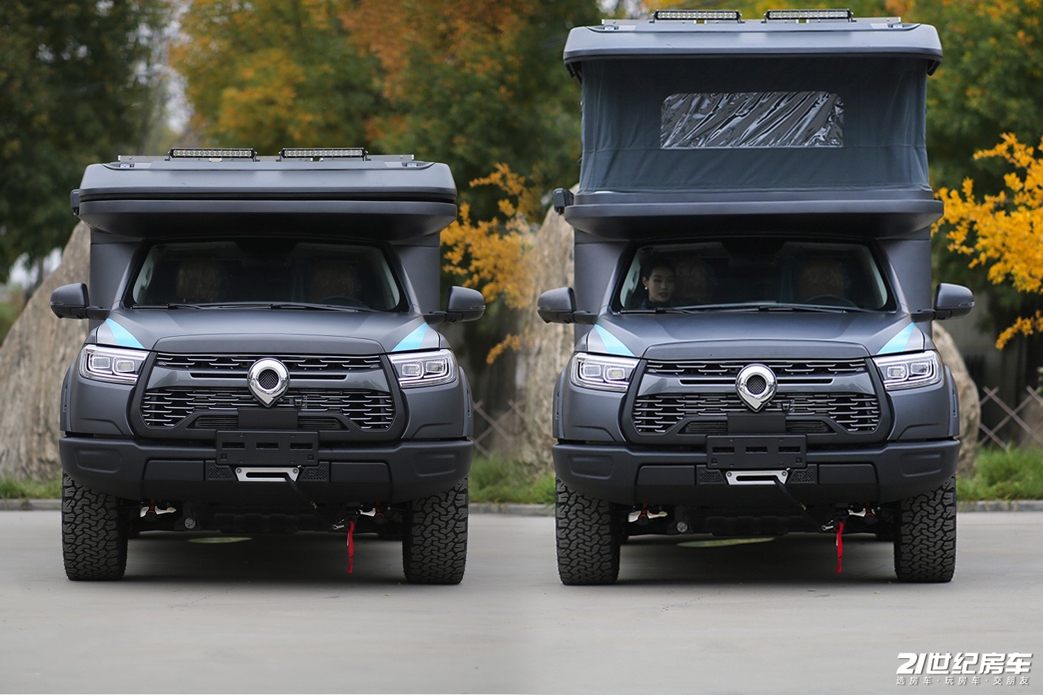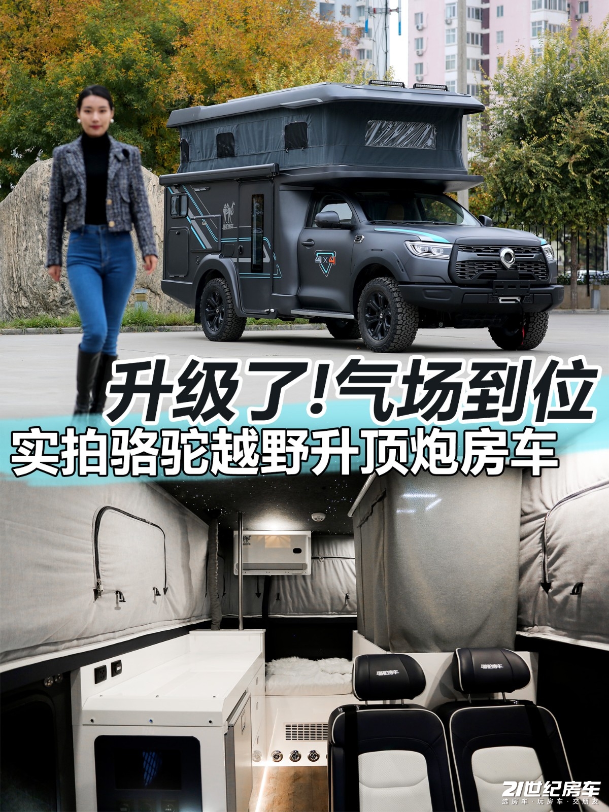 【21RV 实拍】去年年初,览众房车推出了双品牌战略,主打皮卡四驱产品的骆驼房车和主打大空间的来福房车,在细分领域,从最早一车难求的自由炮房车,再到如今推出的第二代升顶炮房车,都是骆驼品牌下非常难得的好产品。经过了第一代的优化和改良之后,第二代车型更为年轻化和时尚化,索性名称直接改为“越野升顶炮”,朗朗上口的叫法更易被人们所熟知。这一代车型在销售战略上依然提供汽油版和柴油版,且每个版本又区分中高配置。目前实拍到的这款新品是柴油版高配车型,它的市场指导价为42.8万元。