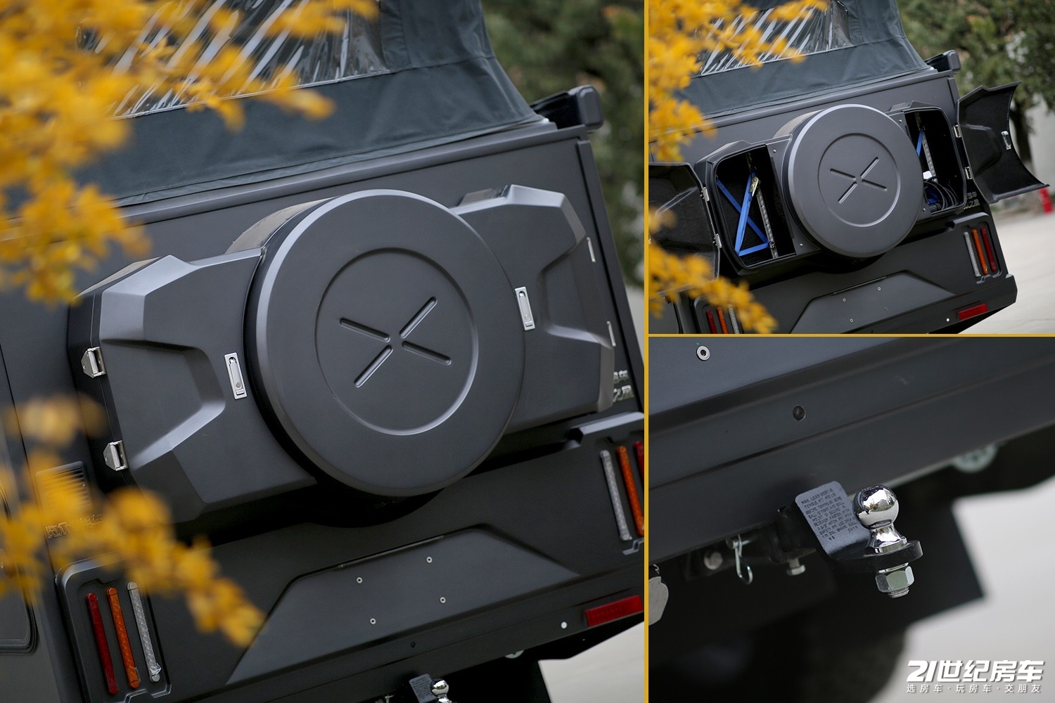 根据整车的外形样式,车尾适配了一款颇具力量感的“小书包”,原为选配,但在高配车型为赠送配置。中间是备胎罩,两侧是小型储物格,内置了导轨用于固定一些户外装备。后保险杠位置出厂已经配置了拖车钩和拖车球,由于这款车合法具备2500kg的准牵引质量,因此在整车允许的最大总质量基础之上可以牵引一款中置轴旅居挂车,以此解决房车内床位少的问题。
