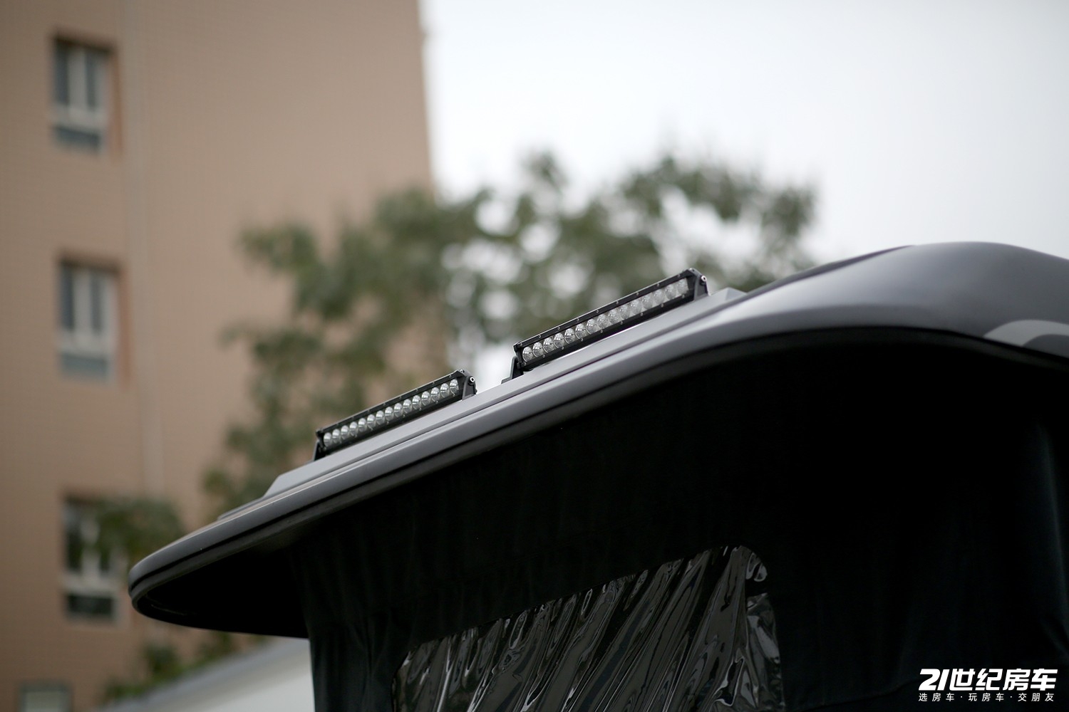 升顶部分“前舌”略微下压,起到一定的扰流作用,前额也配备了一组LED辅助照明灯。升顶机构和原车车厢之间的接缝沾合了非常厚的密封条,且在关闭升顶机构下可以做到极小的缝隙,不论是防水、防尘都还是比较到位的。