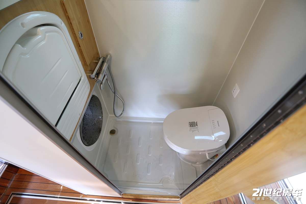 为了给后排留出更加富裕的活动空间,卫浴间位置为此整体前移到了主驾驶座后方,也就是乘客门正对面,可以说不管从前排还是后排都是最佳的路线捷径。卫浴间地板留有凹槽和地漏便于排水。内部拥有赛特福德电动粉碎马桶+智能马桶盖、折叠水盆、带烘干功能的莫博3kg一体式洗衣机、淋浴花洒等设施,满足日常卫浴需求。水路系统方面,这款车匹配主220L+副230L净水箱,80L灰水箱、120L黑水箱。