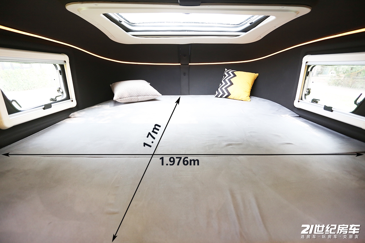 额头床内部以黑黄配色为主,达到了一种高端定制的感觉,侧窗、天窗也为内部提供了充足采光度。额头床尺寸为1.976x1.7(m)可供两名成年人休息,值得一提的是额头床与车顶的空间充裕,大大降低了头部压抑感。