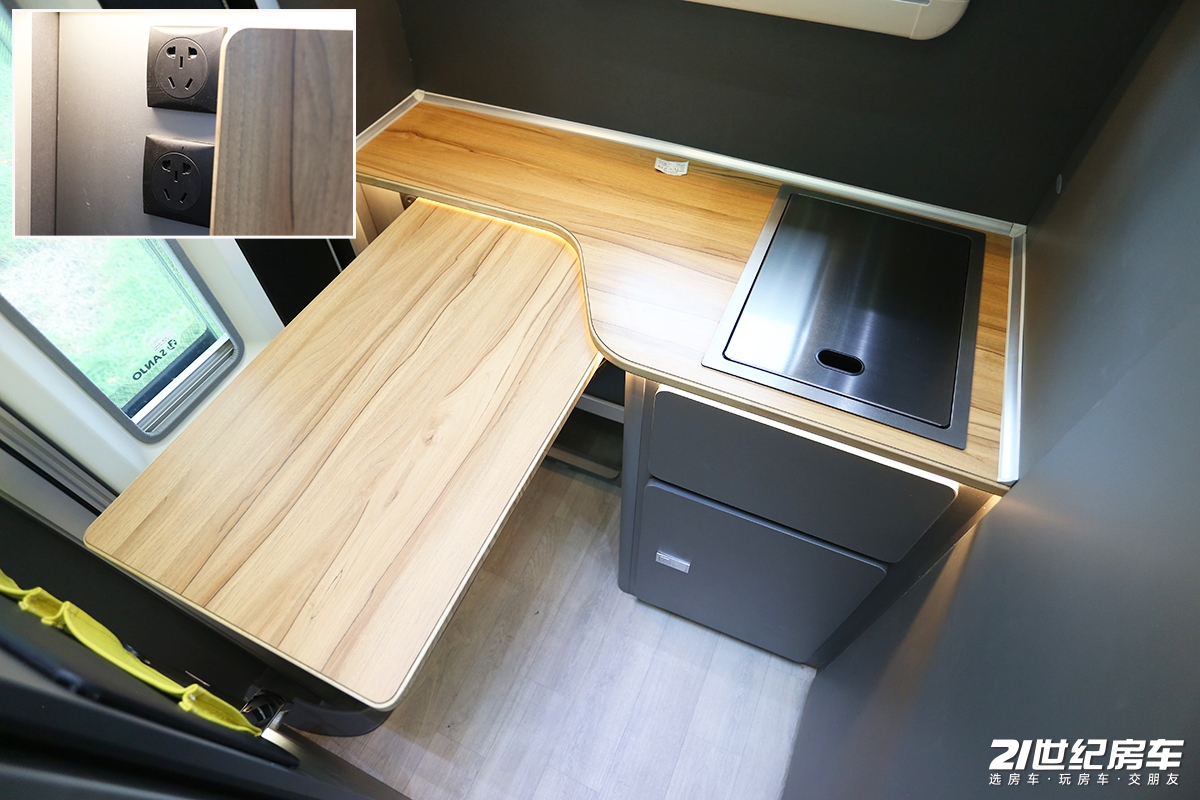 尾置厨房台面仅内嵌有带盖洗手池,整体操作台宽裕,侧方铺设有很大面积的延伸桌板,而且在侧方还配备了电源接口,这样用户自行配一台电磁炉就可以制作简餐。