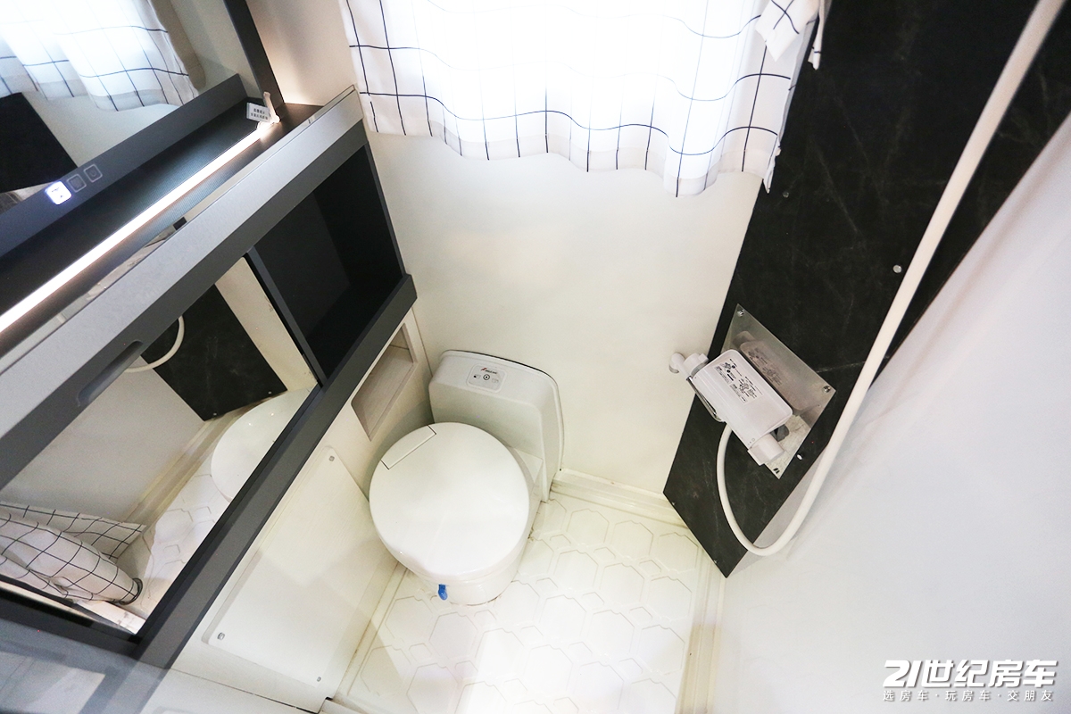 卫浴间紧邻厨房区,内部空间利用率很高,即使在空间有限的皮卡房车里,用户体验感依旧不错。主要配置包括三乔固定坐便器、折叠洗手盆、智能卫浴镜等。
