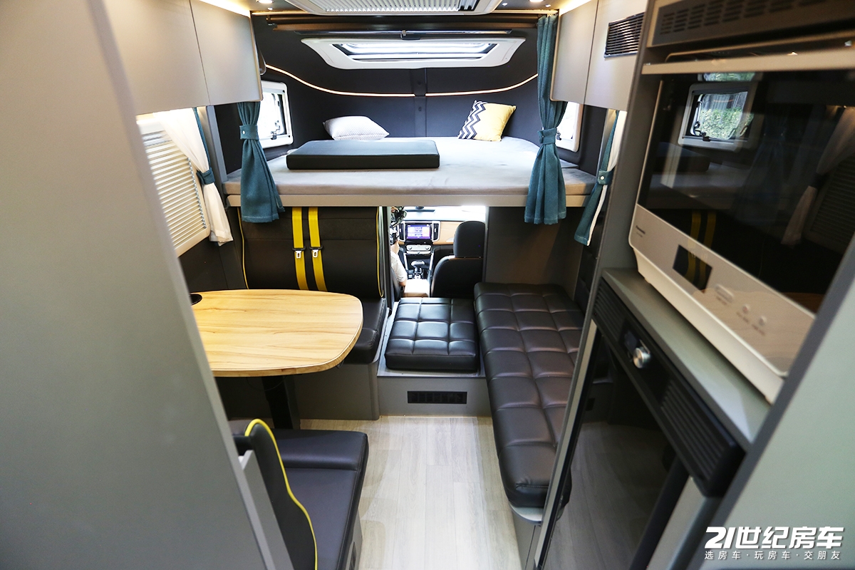 在配色方案上,新车也是相当讲究,黑色、黄色、灰色组合让车内看起来年轻运动,官方把这种配色方案称为宇宙灰+急速黄,在房车设计中更突出个性。
